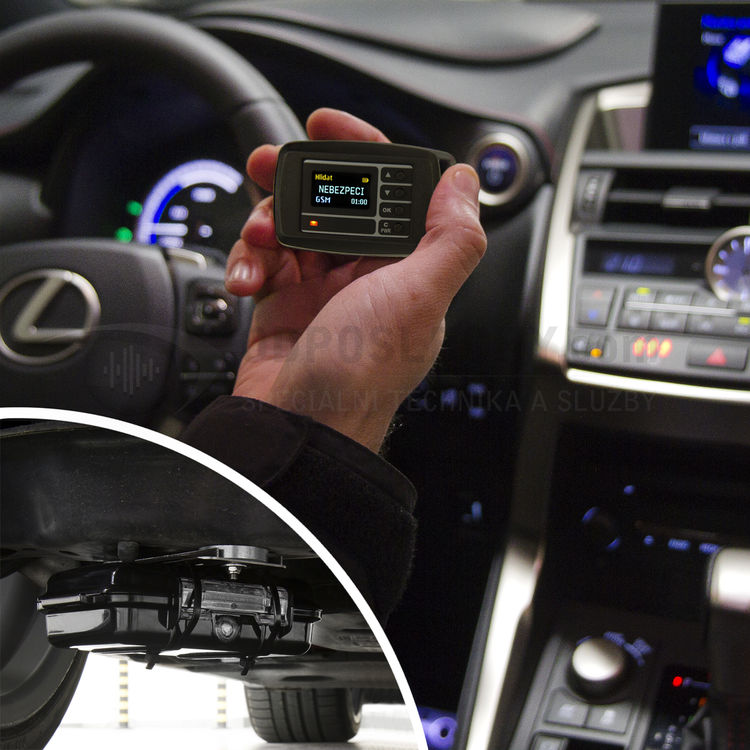 Miniaturní detektor operativně odhalí odposlechová a lokační zařízení v automobilu. GPS lokátor může být ukrytý na různých místech v interiéru vozu. Pokud narušitel nemá do automobilu přístup, může sledovací zařízení umístit do plastových nárazníků nebo přichytit magnetem k podvozku. Vhodným místem ke kontrole vozidla jsou podzemní garáže v nákupních centrech. Zejména ve spodních patrech je výrazně oslabený signál běžných frekvencí, což usnadňuje prohlídku. Navíc jsou zde odposlechová zařízení nucena vysílat maximálním výkonem.