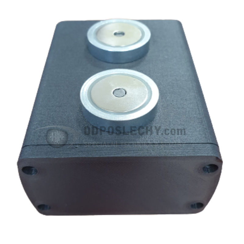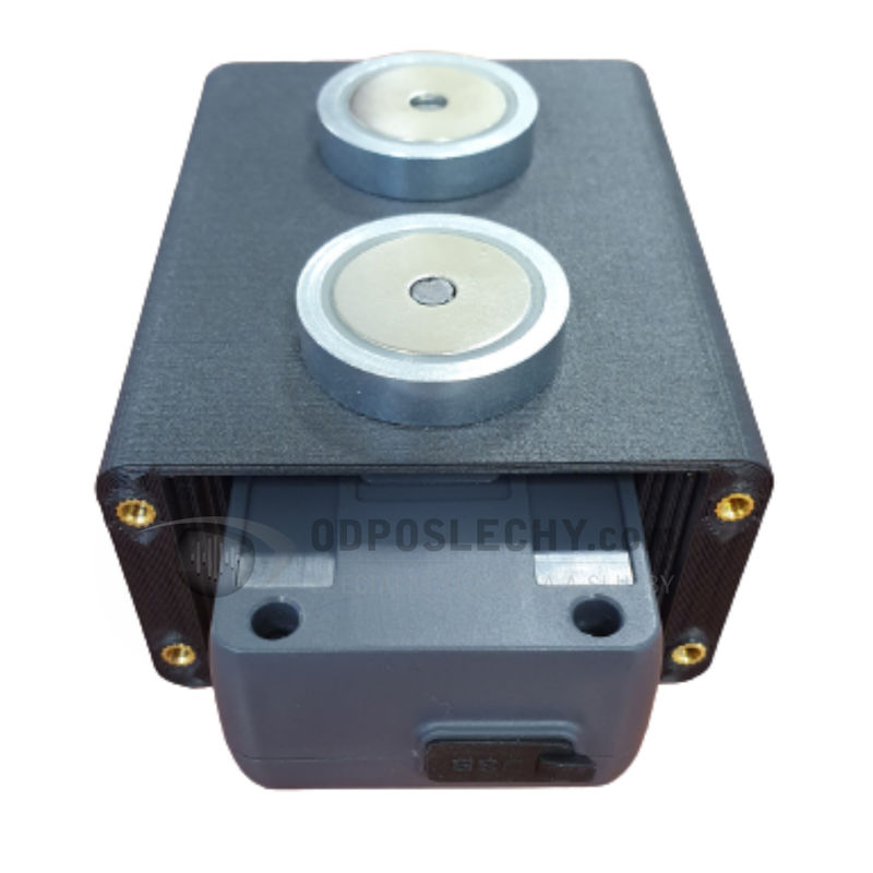 Pouzdro s magnety je ideální pro umístění pod podvozek automobilu. Stabilitu ve vysokých rychlostech a při jízdě terénem zajišťují dva neodymové magnety s celkovou silou 660 N, což odpovídá odtrhové síle 2x 33kg. Přesto se nemusíte obávat odstranění lokátoru po ukončení sledování. Lze jej snadno odinstalovat uchopením za jeden z okrajů a použitím páky.