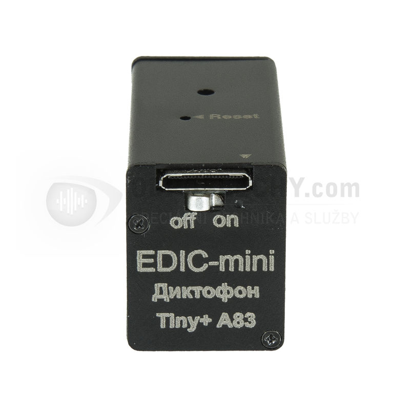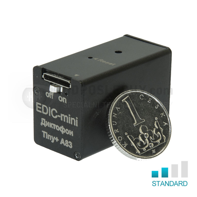 Mikro-diktafon EDIC A83 komerční verze EN je miniaturní audio odposlech s nahráváním do vnitřní paměti. Výborně se hodí pro dlouhodobé monitorování místnosti. Při umístění do kapsy u kalhot nebo pouzdra od brýlí lze také skrytě nahrávat průběh pracovního jednání či neočekávaného rozhovoru. Mini-diktafon pak lze jednoduše připojit k počítači pomocí USB adaptéru, kde si záznam poslechnete. Je kompletně zapouzdřen v kovovém obalu, proto je stížena možnost jeho rušení elektromagnetickou rušičkou mikrofonů.