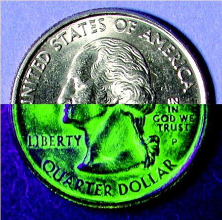 Neviditelný inkoust pro značení mincí je speciálně vyvinut pro vytváření identifikačních značek na všech kovových penězích, které jsou lidským okem prakticky nedetekovatelné. Pro zviditelnění tohoto označení se používá dlouhovlnné UV světlo, pod jehož svitem dochází k jasně zelené fluorescenci. Je možné použít kapesní UV svítilnu nebo výkonnou ruční UV LED svítilnu, kdy je možné bez problémů zviditelnit stopy na jasném denním světle.