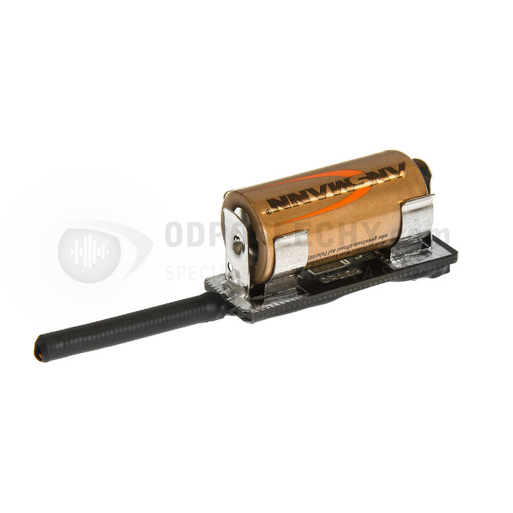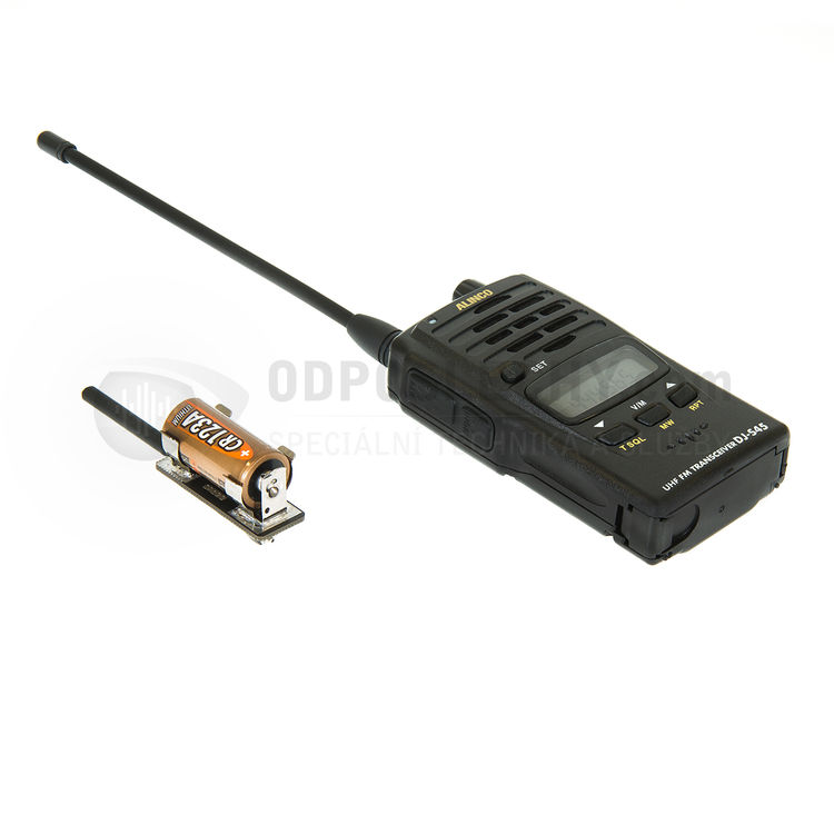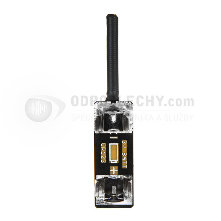 Bezdrátový miniaturní mikrofon (štěnice) s UHF vysílačem; zvukovodný mikrofon Knowles; doba provozu 60 hodin; napájení baterií CR 123