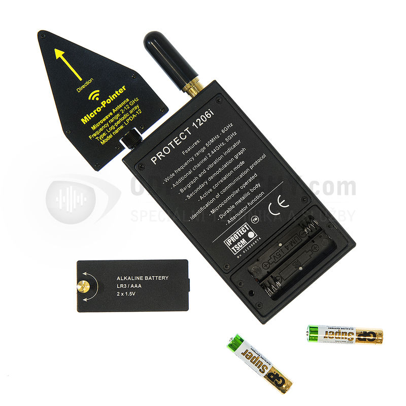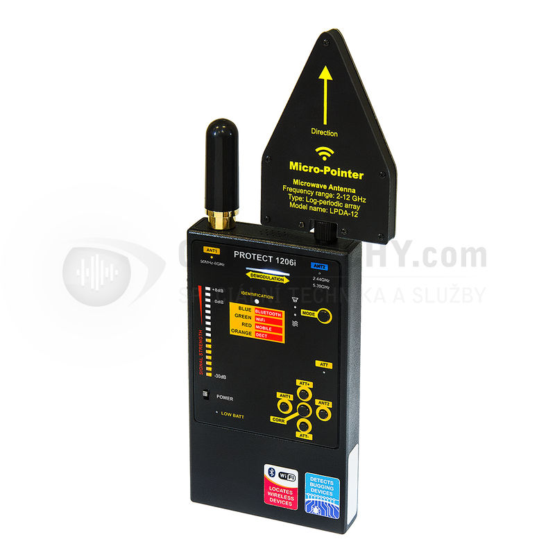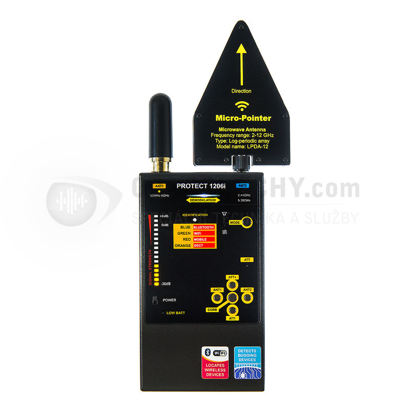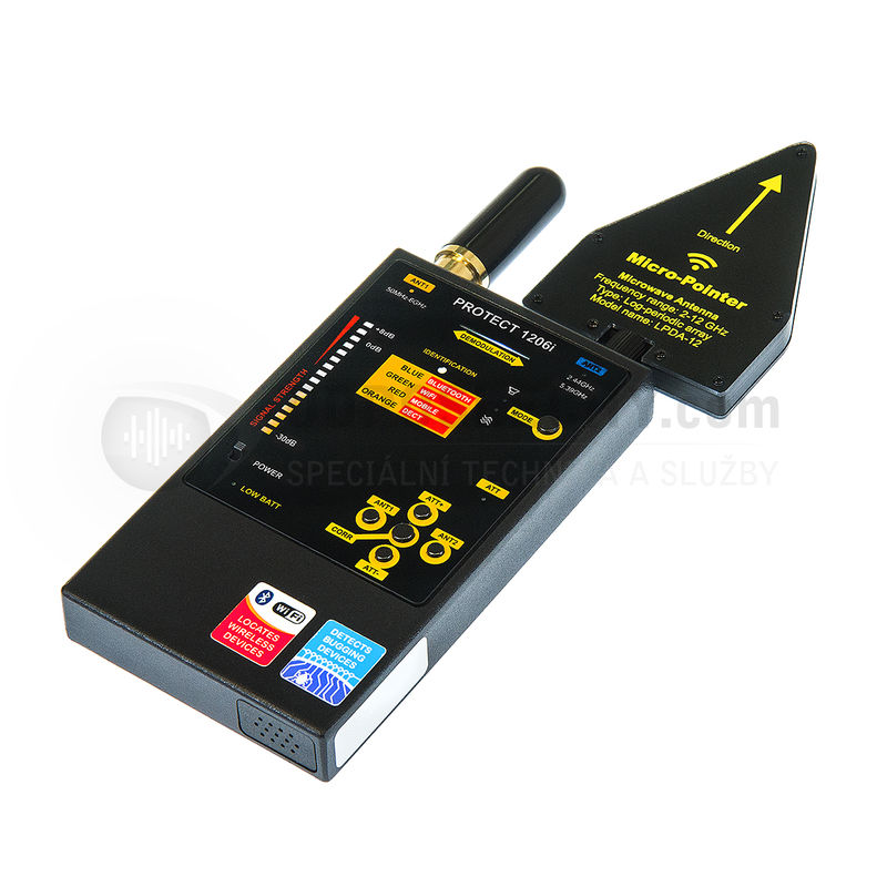 Profesionální ruční detektor Protect 1206i je určen pro univerzální vyhledávání odposlechů vysílajících ve frekvenčním rozsahu 50 až 6000 MHz. Toto pásmo zahrnuje všechny běžné bezdrátové odposlechy, bezdrátové skryté kamery, GSM odposlechy, GPS lokátory pro sledování polohy a další prostředky. Poskytuje tak spolehlivou ochranu před většinou, v dnešní době dostupných a používaných, zařízení používaných pro skryté získávání informací.